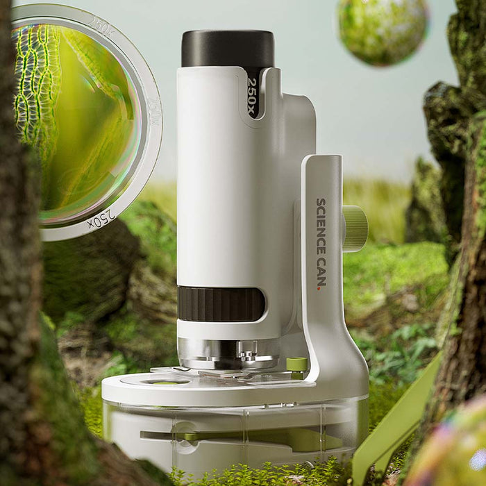 This microscope includes a stand for desktop use, and it can also fit in a pocket for outdoor exploration. It’s sized to comfortably fit in kids' hands, and it's compatible with a smart phone for taking great photos of what you see! Ages 8+. 60x to 120x magnification.