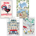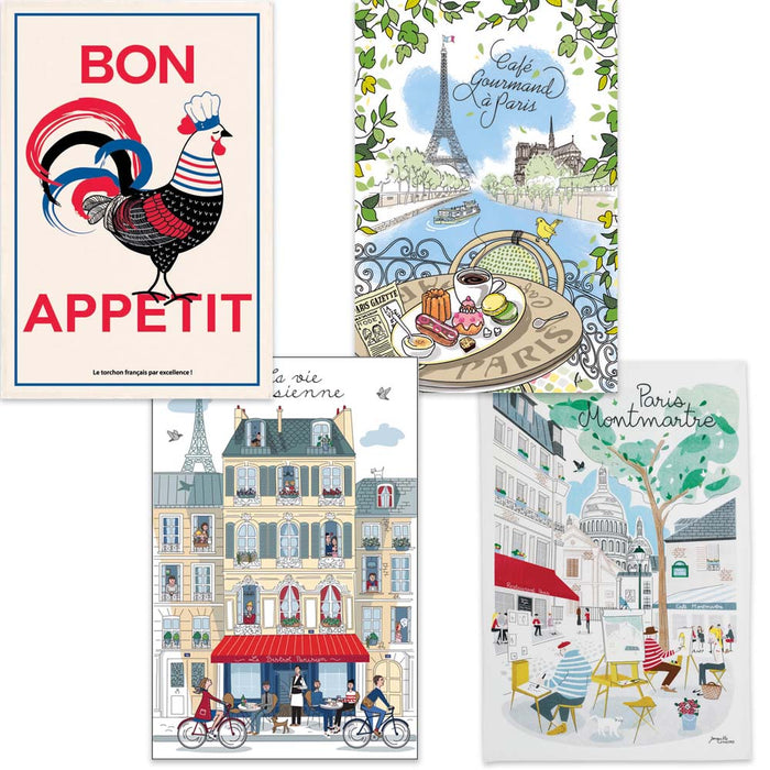 Four French Kitchen Towels - Bon Appétit Rooster, Café Gourmand, La Vie Parisienne, and Montmartre