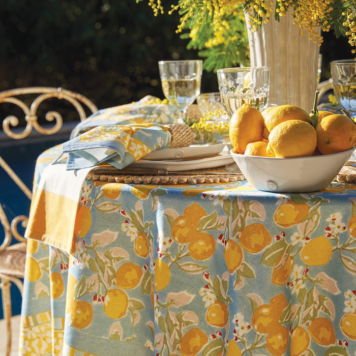 Designs that reflect the idyllic landscape and traditional art of Provence. Citron Blue is inspired by the citrus groves of Provence and enlivens any indoor room or outdoor table with style. All tablecloths are handprinted by skilled artisans. 100% cotton. Machine washable. 59” x 86” rectangle, seats 4-6.