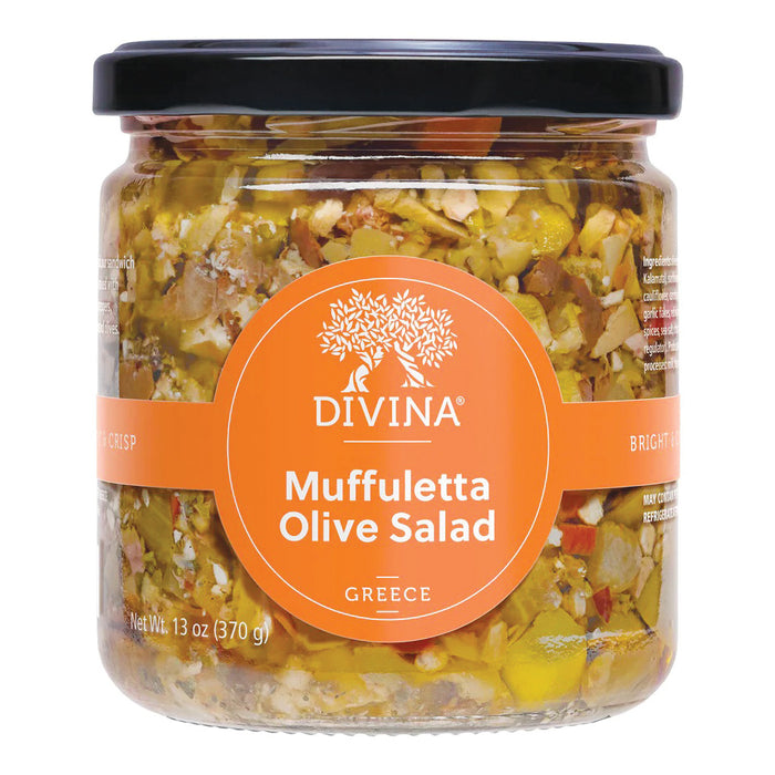 Muffuletta salad (Greek olives, Kalamata), sunflower oil, red peppers, cauliflower, carrots, celery, pepperoncini, garlic flakes, red wine vinegar, capers, spices, sea salt, citric acid (acidity regulator).