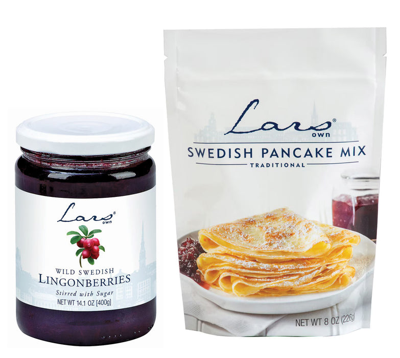 Thinner than an American pancake, Swedish pancakes are closer to French crêpes. Wonderful folded into fourths and topped with lingonberry jam and yogurt or filled with fruit and whipped cream for desserts. Lars Lingonberry Jam is made with wild Swedish lingonberries, and it's a treat with Swedish Pancakes, meatballs, and duck. Set includes: Two Lars Swedish Pancake Mixes, 8 oz. each; one jar Lingonberry Jam, 14 oz.
